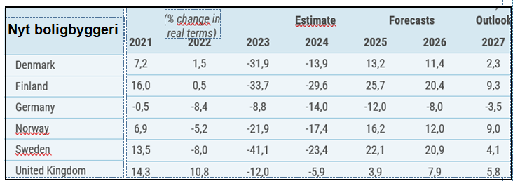 Men prognoserne for Vesteuropæisk nyt boligbyggeri peger dog på en lille positiv vending i 2025 på 0,2 pct.. Og for 2026 og 2027 mere end en 10-dobling til henholdsvis 3,5 og 3,3 pct. For andet end boligbyggeri vækst på 1,1 pct. i 2025 for at doble til 2,4 i 2026 og i 2027 falde til 1,5 pct.